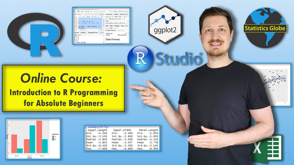 Unlimited lifetime access to the online course "Introduction to R Programming for Absolute Beginners" by Joachim Schork and the Statistics Globe team.